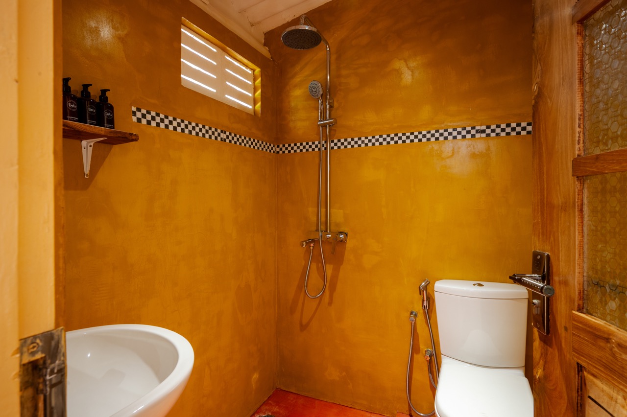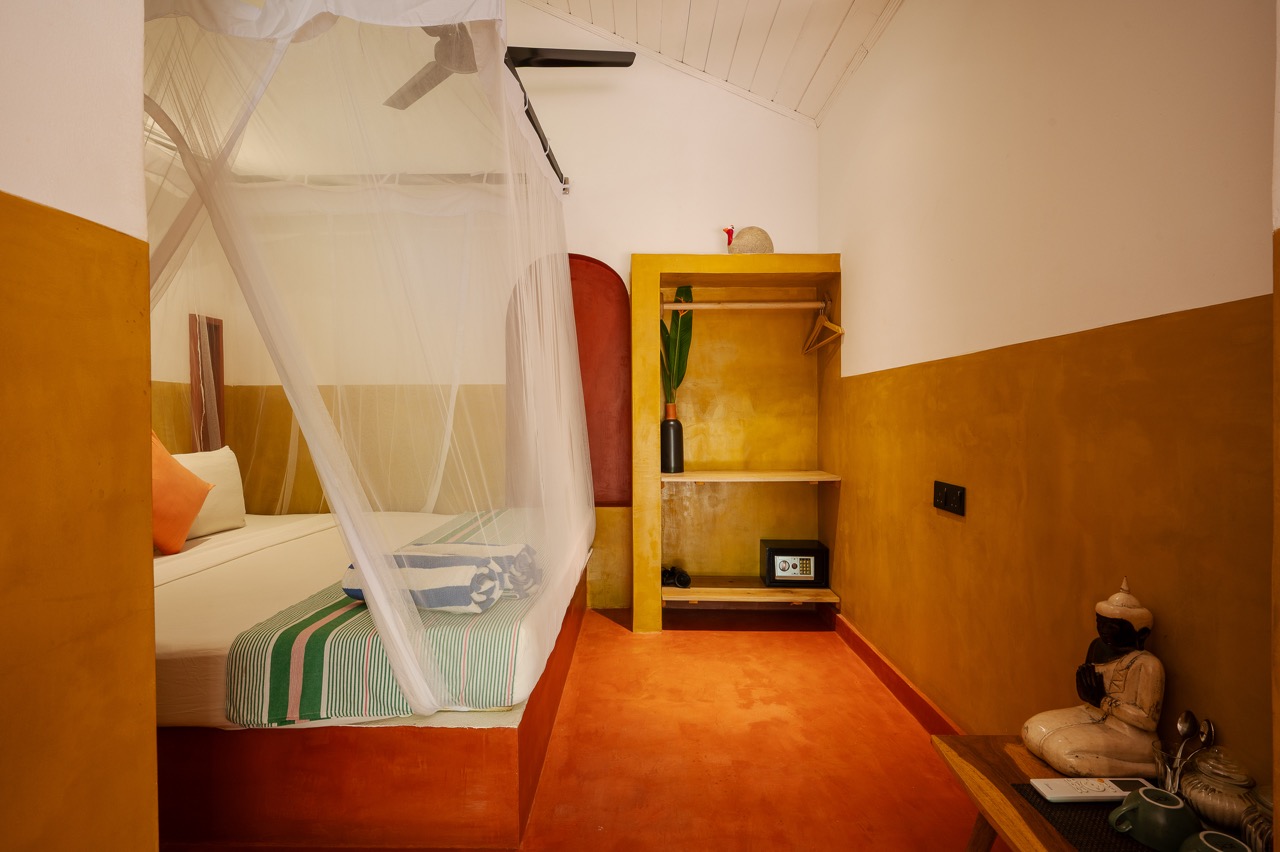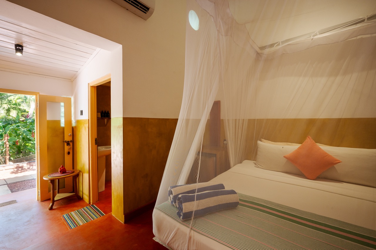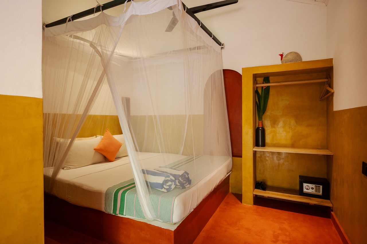 Located in a shared, air-conditioned building, each cozy 7’x7’ studio dorm comes equipped with a comfortable 9’ single bed, a private safe, free wifi, and bed linens and towels. The building shares bathroom facilities composed of three showers and three restrooms, providing ample space for all hostel guests. Our shared studio hostel is the perfect option for solo travelers or friends passing through the south coast, looking for somewhere peaceful to sleep after long days spent in the surf, sand, or shala.