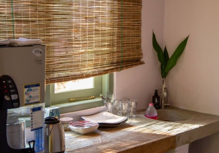 Located in a shared, air-conditioned building, each cozy 7’x7’ studio dorm comes equipped with a comfortable 9’ single bed, a private safe, free wifi, and bed linens and towels. The building shares bathroom facilities composed of three showers and three restrooms, providing ample space for all hostel guests. Our shared studio hostel is the perfect option for solo travelers or friends passing through the south coast, looking for somewhere peaceful to sleep after long days spent in the surf, sand, or shala.
